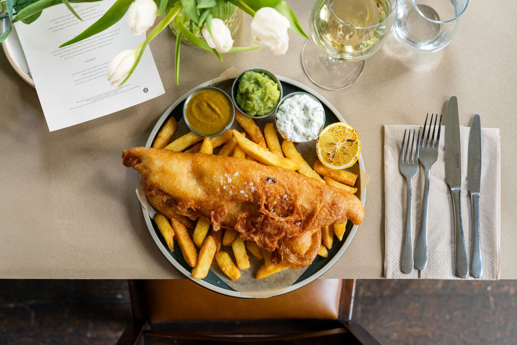 The star of the show? Our iconic fish and chips, widely loved by visitors and locals alike and one of the most popular dishes on the menu. Crisp golden batter, flaky fish, tartare sauce, curry sauce and mushy peas, it’s the perfect taste of Britain.